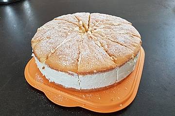 Um den ersten Tortenboden einen Ring bzw. den Springformrand legen und die Quark-Sahne-Creme daraufgeben und glattstreichen. Den zweiten Boden aufsetzen und über Nacht kalt stellen (der obere Boden kann mit einem Tortenteiler geteilt werden). Vor dem Servieren mit Puderzucker bestäuben.