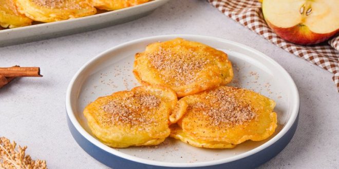 Für die süßen Apfelküchle zuerst Milch, Mehl, Zucker und eine Prise Salz zu einem dicken Teig verrühren. Dann die Eier einzeln nach und nach dazugeben und unterrühren. Anschließend die Äpfel schälen und das Kerngehäuse – am besten mit einem Apfelausstecher – entfernen- Die Äpfel danach quer in nicht zu dünne Scheiben schneiden und mit Zitronensaft beträufeln. Nun das Öl in einer Pfanne erhitzen, die Apfelscheiben durch den Teig ziehen und sofort im heißen Öl auf beiden Seiten goldgelb ausbacken.