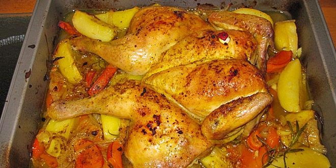Arabisches Zitronen – Knoblauch Huhn mit Kartoffeln und Zwiebeln