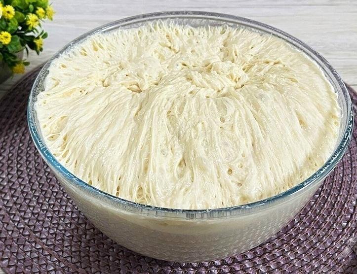 1. So geht es: Einfach mal alle Zutaten in eine Schüssel geben und zu einem glatten Teig verarbeiten, mit Frischhaltefolie zudecken und 12 Stunden gehen lassen. (Ich habe den Teig abends zubereitet und die ganze Nacht gehen gelassen).