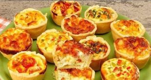 Zutaten 3 Eier 120g Ricotta-Käse 150g Joghurt 1 TL Sonnenblumenöl Eine Prise Salz Eine Prise Pfeffer Oregano Kirschtomaten Mais Geriebener Käse Gekochter Schinken Erbsen Paprikapulver Mürbeteig oder Blatterteig Zubereitung Zuerst den Teig in Muffinform-große Kreise schneiden. Dann Legen Sie jeden Schnitt in ein Loch im Muffinblech. Als nachstes Ricotta, Joghurt, …