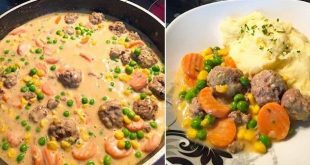 Zutaten: 500 g Hackfleisch 1 kleine Zwiebel schälen und klein würfeln etwas Oliven Öl, zum Anbraten Erbsen,Karotten&Mais (tiefgefroren) 400 ml Fleischbrühe 250 ml Sahne Salz,Pfeffer&Paprikapulver zum Würzen Schnittlauch,Petersilie evtl.Saucenbinder Zubereitung: Das Hackfleisch mit Salz,Pfeffer und Paprika würzen,dann kleine Bällchen formen und diese in einer Pfanne mit etwas Öl kräftig anbraten. …