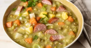 Erbseneintopf nach Bundeswehrrezept Zutaten 500 g Schälerbsen 100 g Knollensellerie 100 g Karotte(n) 1 Stange/n Porree 2 m.-große Zwiebel(n) 300 g Kartoffeln, mehligkochend 100 g Bauchspeck, geräuchert 20 g Rindertalg 1 TL, gehäuft Majoran 2 Stängel Petersilie 2 Liter Wasser 8 TL, gehäuft Gemüsebrühe, gekörnte (leicht gehäufte TL) Salz und …