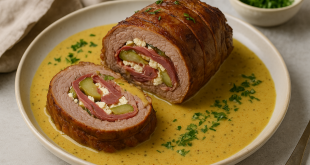 Schichtbraten in Senfsauce (mit Rindfleisch) Zutaten 3 Gewürzgurken, in Scheiben geschnitten 10 Scheiben Rinderschinken oder geräucherter Rinderspeck (z. B. Pastrami) 3 Zwiebeln, in Scheiben 220 g Feta 5 Rinderrouladen (dünn geschnittenes Rindfleisch) Muskat Senf Salz Pfeffer Für die Sauce: 420 ml alkoholfreier Rotwein oder roter Traubensaft 500 ml Rinderfond oder Gemüsebrühe …