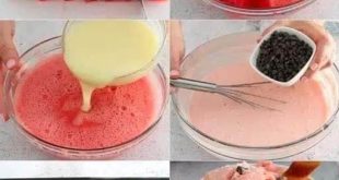 Wassermeloneneis: kühl und cremig, ein Genuss an heißen Sommernachmittagen! ZUTATEN 625 ml (2 1/2 Tassen) frischer Wassermelonensaft 100 g (1/2 Tasse) Zucker 20 g (3 EL) Speisestärke 150 g (1 Tasse) Wassermelonenstücke – fein gehackt Salz 250 ml (1 Tasse) Schlagsahne – 1 Tasse gekühlt Rote Lebensmittelfarbe METHODY In einem …