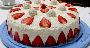 Erdbeer Raffaello Torte ZUTATEN 3 Ei(er) 115 g Zucker 2 Tropfen Aroma (Backöl) 50 g Mehl 50 g Speisestärke 1 TL Backpulver 200 g Konfekt (Raffaellos) 500 g Erdbeeren 600 g Schlagsahne 2 Pck. Vanillezucker 1 Pck. Sahnesteif 25 g Kokosraspel ZUBEREITUNG Die Eier trennen. Die Eiweiß mit 3 EL …