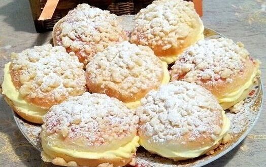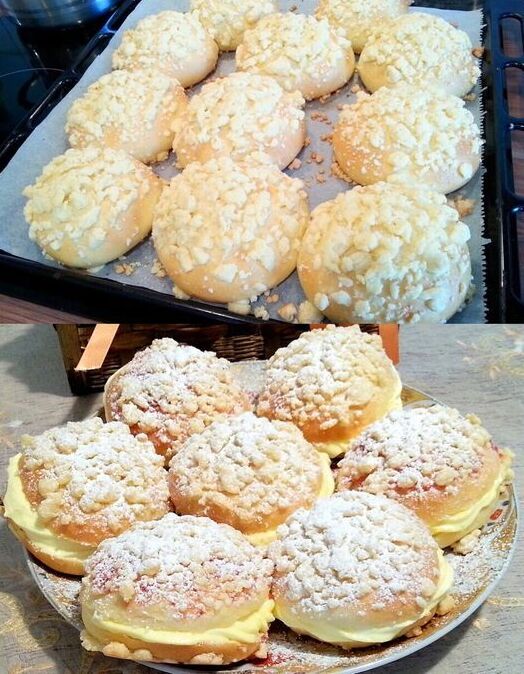 Dann Bestreicht die Taler mit etwas Milch und verteilt dann die Streusel darauf. Deckt nun die Streuseltaler mit einem Geschirrtuch ab und lasst sie noch einmal für 30 Minuten gehen, bevor ihr sie im vorgeheizten Backofen bei 170 Grad Umluft für etwa 15 Minuten goldbraun backt.