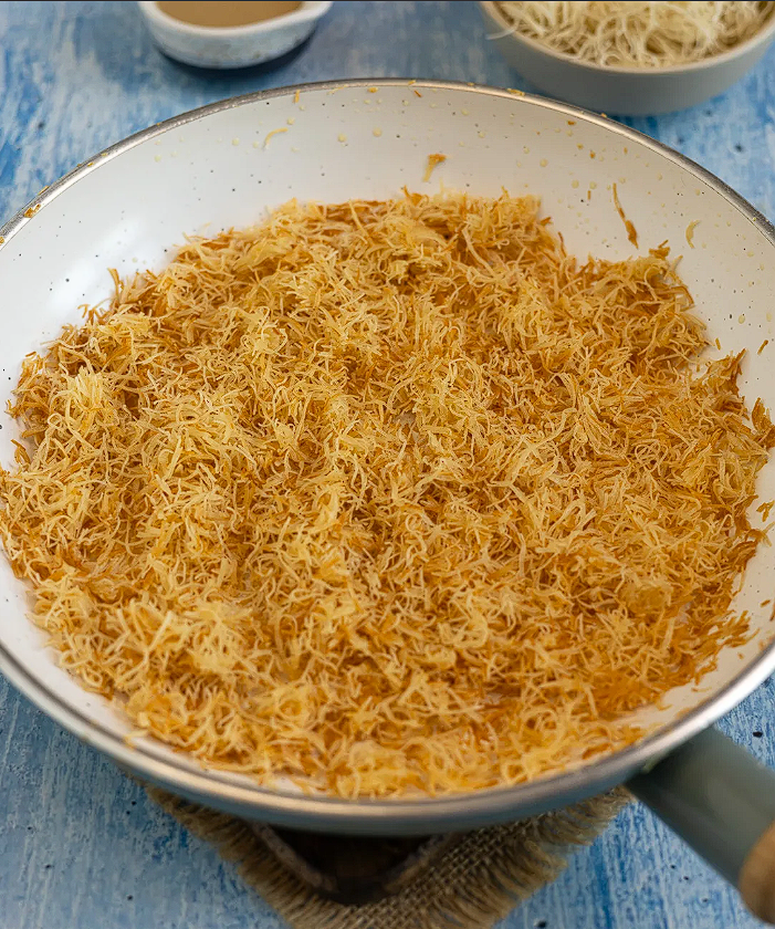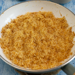 - In der Zeit das Engelshaar grob schneiden. Butter in einer Pfanne zerlassen und das Engelshaar hineingeben. Bei mittlerer Hitze goldbraun rösten. Zwischendurch umrühren, damit nichts anbrennt.