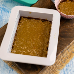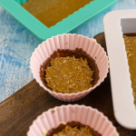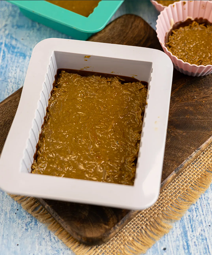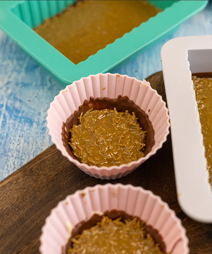 - Die Masse sollte nun halbwegs abgekühlt sein und kann dann in die Silikonform gegeben werden, ca. 5 mm hoch. Nochmal kalt stellen, damit die Masse fest werden kann.