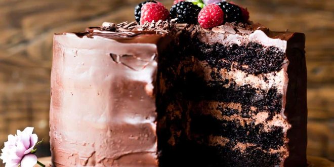 Dieser super-saftige dunkle Schokoladenkuchen kombiniert ungesüßtes Naturkakaopulver und dunkles Kakaopulver für einen besonders intensiven Geschmack. Fülle den Kuchen mit einer vereinfachten Schokoladenmousse und überziehe ihn mit einer halb-süßen Schokoladenganache. Falls gewünscht, kannst du Ganache und Mousse auch im Voraus zubereiten. Siehe Hinweise.