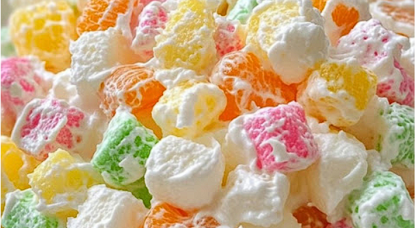 Ananas, Mandarinen, Mini-Marshmallows, Kokosraspeln, gewürfelten Apfel und halbierte Trauben vorsichtig unterheben.