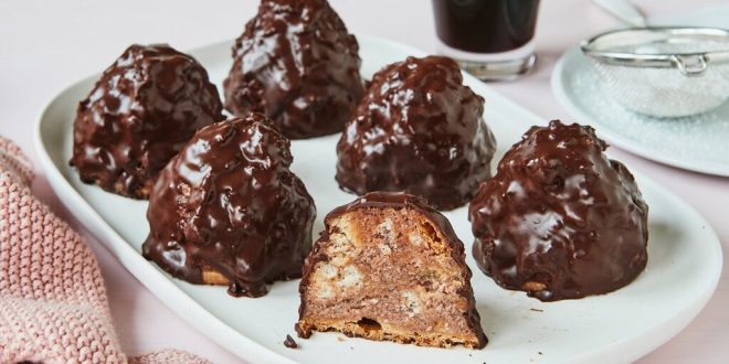 Den Tortenboden ganz trocknen lassen und fein zerkrümeln. Die Buttercreme nach Vorschrift zubereiten, 1 EL Kakao zufügen und nach Geschmack mit Rum verfeinern. Die Biskuitkrümel untermischen. Auf die Kekse mit der Buttercrememasse spitze Häufchen setzen, die Granatsplitter mit Schokoguss überziehen.