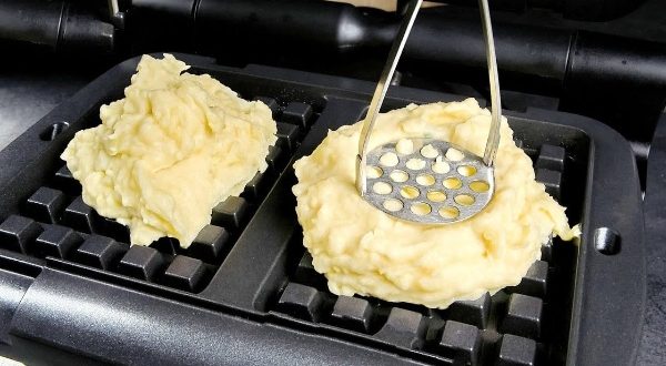 3. Als nachstes in 2 großen Pfannen (oder Waffeleisen) ein gutes, hochwertiges Pflanzenöl erhitzen und den Kartoffelteig esslöffelweise in kleinen Portionen nebeneinander in die Pfannen setzen. Stets im Auge behalten und sobald eine goldbraune Farbe erkennbar ist, die Reibekuchen wenden.