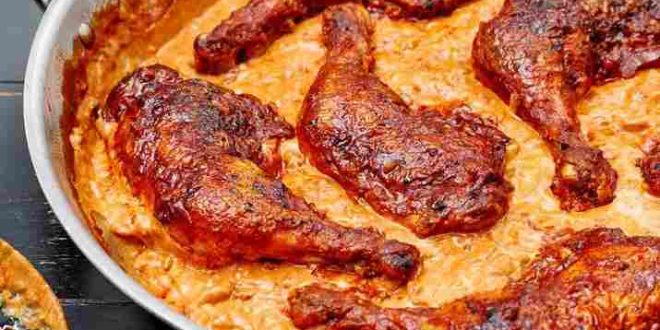 Danach stellt ihn auf 210°C (Ober-/Unterhitze) und lasst das Ganze für 55 bis 1 Stunde garen. Das Ergebnis sollte ein Blech mit Knusperhautschenkeln und würzigem Reis sein.