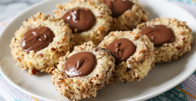 Formen Sie den Teig in 1-Zoll-Runde Kugeln. Die Kugeln in das Eiweiß und dann in die gehackten Haselnüsse rollen. Legen Sie die Kugeln 1 Zoll voneinander entfernt auf die vorbereiteten Backbleche. Drücken Sie dann Ihren Daumen in die Mitte jeder Kugel.