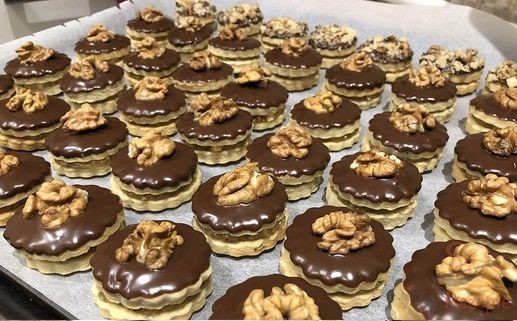 Dann Jeweils zwei Plätzchen zusammenkleben und dann in die Schokoladenglasur eintauchen. Ich mache die Schokoladenglasur folgendermaßen: ich schmelze eine Schokolade mit hohem Kakaoanteil im Wasserbad und für je 100 g Schokolade gebe ich 1 Esslöffel Butter dazu.