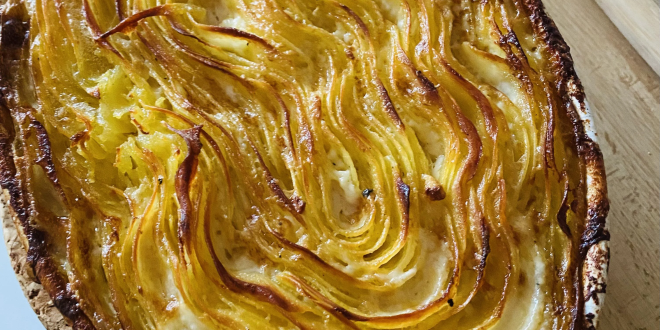 Die Kartoffelscheiben stehend von außen nach innen versetzt nebeneinanderstapeln.
