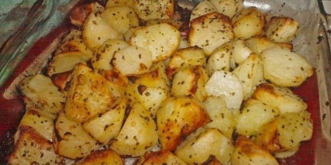 Die Kartoffeln auf einem tiefen Backblech verteilen. Die anderen Zutaten (außer Wasser) dazugeben und gut vermischen, so dass alle Kartoffeln gut bedeckt sind.