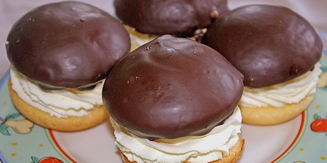 Eine Indianerform (es geht auch auf dem Backblech, man muss die Krapferln mit einem runden Glas ausstechen) mit der Masse füllen und bei ca. 180° – 15 Minuten backen. Dann aus der Form lösen und abkühlen lassen. Inzwischen Schlagobers mit Staubzucker steif schlagen. Den Schlag mit einem Spritzsack auf die unteren Hälften aufspritzen und die anderen Hälften aufsetzen. Die Oberseiten mit Marillenmarmelade überziehen und mit flüssiger Schokolade übergießen. (Schokolade mit etwas Milch aufschmelzen, bis sie eine dickflüssige Konsistenz hat).