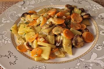 Möhren putzen, waschen und in dünne Scheiben schneiden. Zu den Kartoffeln geben. Brühe zugießen und alles weitere 10 Min. garen. Rostbratwürstchen in dem heißen Öl rundum braun braten. Sahne und Senf zum Gemüse geben, aufkochen.
