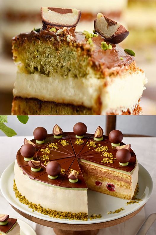 Für die Pistaziensahne 100 g Pistazien fein mahlen. 200 g Sahne mit 1 1/2 Pck. Sahnesteif steif schlagen und die gemahlenen Pistazien unterheben. Die Pistaziensahne auf die Marzipandecke streichen und mit dem dritten Tortenboden abdecken.