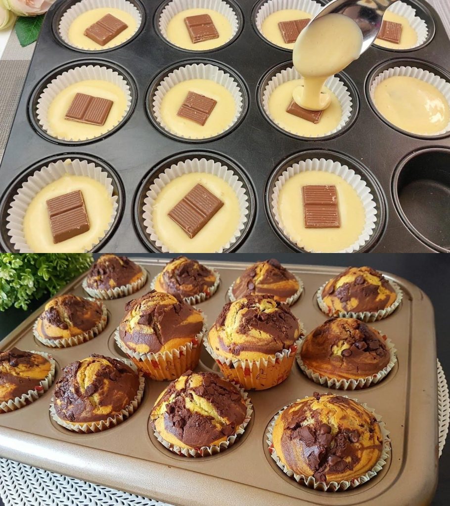 3. Jetzt die Schokoladenstückchen in den Muffinteig stecken. Bei 180°C 20 – 25 Minuten backen. Fertig!