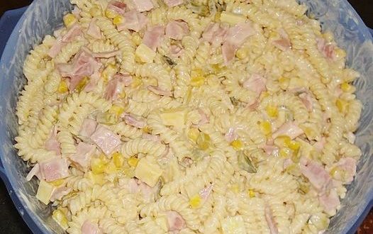 3. Als nachstes die kleingeschnittene Wurst, gewürfelten Käse, gewürfelte Tomaten und in Scheibchen geschnittene saure Gurken und die abgekühlte Nudel – Erbsenmischung zu dem Miracel Whip geben, durchrühren und mindestens 3 Stunden kalt stellen. Am besten über Nacht, dann schmeckts am besten.
