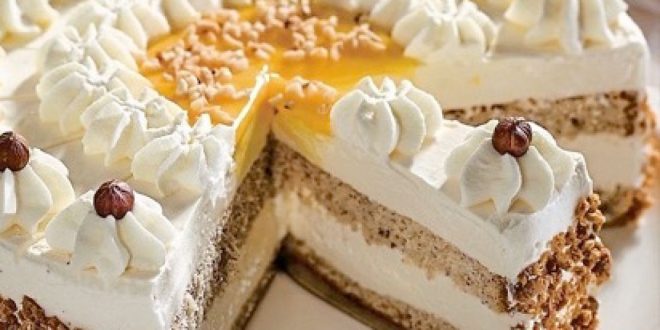 Jetzt für den Biskuit Eier, Zucker und 4 Esslöffel Wasser mindesten 8 Min weißschaumig rühren. Nüsse, Mehl, Salz mit Backpulver mischen und unterheben. Füllen Sie die Masse in eine mit Backpapier ausgelegte Springform und im heißen Backofen 30-35 Min backen. Abkühlen lassen.