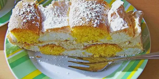 3. Als nächstes, auf ein mit Backpapier belegtes Blech abwechselnd weiße und danach gelbe Streifen aus beiden Massen nebeneinander aufstreichen oder mit einer Spritztülle aufspritzen und dann im vorgeheizten Rohr bei 170 Grad ca. 30 Min. backen.