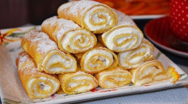 Für die Creme die Zutaten in eine Rührschüssel geben und mit dem Handrührgerät zu einer dickflüssigen Creme verrühren. Die Pfannkuchen mit der Creme füllen.