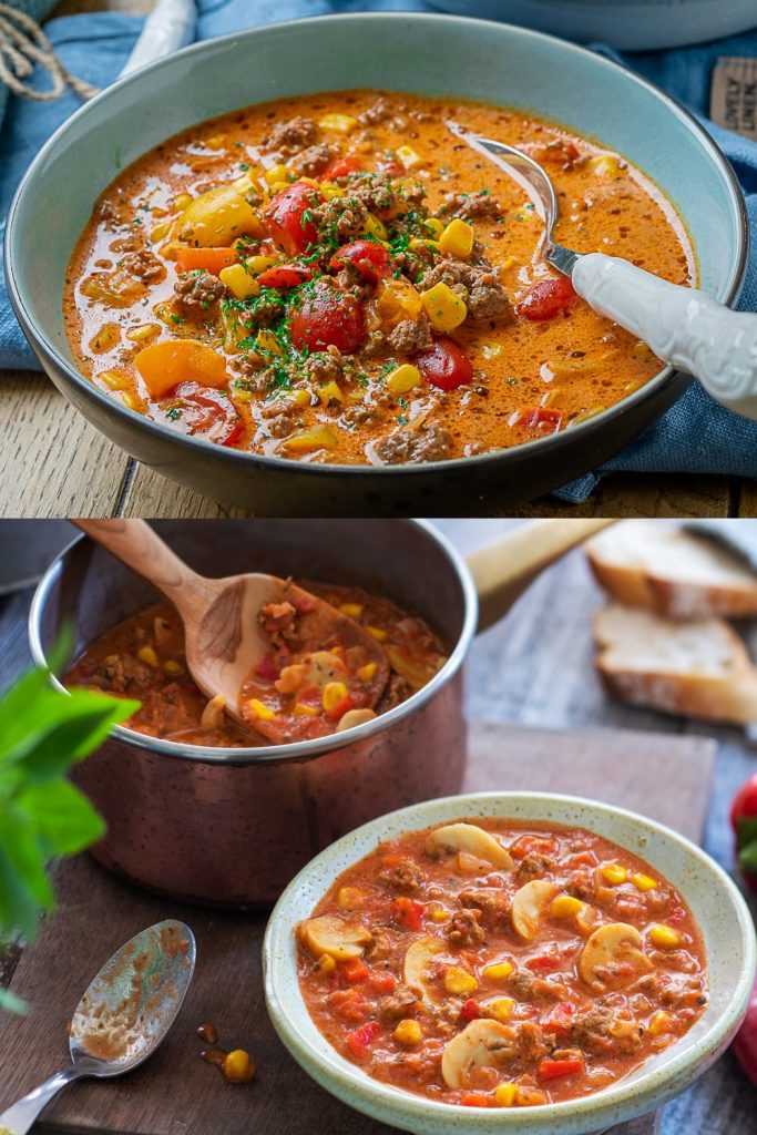 Die Zwiebeln würfeln und mit dem Hackfleisch in Olivenöl anbraten. Die Paprikaschoten ebenfalls würfeln und mit den Champignons sowie dem Mais zum Hackfleisch geben. Alles kurz anbraten, anschließend mit der Gemüsebrühe ablöschen. Die Sahne, die Tomatensauce und den Sahneschmelzkäse hinzugeben und ca. 10 Minuten köcheln lassen. Zum Schluss mit Salz, Pfeffer und Oregano abschmecken.