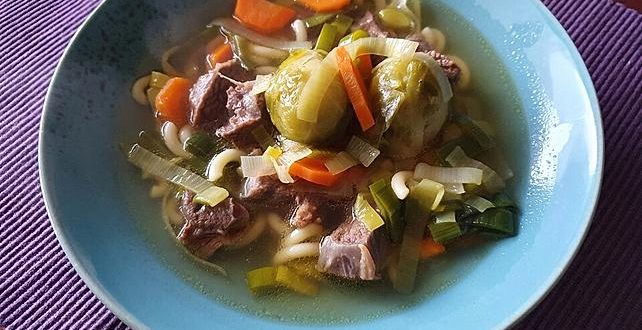 Fleisch aus der Brühe nehmen und beiseitestellen. Brühe durch ein Sieb in einen Topf gießen. Beiseitegestelltes Suppengrün und Lauch zugeben. Zugedeckt aufkochen und bei milder Hitze 10 Minuten kochen lassen. Nudeln zugeben und nach Packungsanweisung in der Brühe garen. Inzwischen das Fleisch vom Knochen lösen, Sehnen und Fett entfernen. Fleisch 2 cm groß würfeln und in die Brühe geben. Schnittlauch in feine Röllchen. Suppe evtl. nachwürzen und mit Schnittlauch bestreut anrichten.Guten Appetit!
