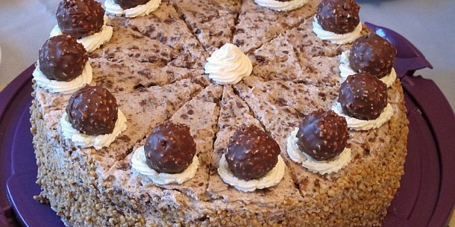 Den letzten Becher Sahne steif schlagen und damit den Rand bestreichen sowie etwas für die Dekoration übrig lassen. Die 6 beiseite gelegten Rocher nun halbieren und oben auf dem Tortenrand verteilen (das ergibt dann 12 Tortenstücke). Mit der restlichen Sahne nach Bedarf verzieren. Bis zum Verzehr kalt stellen.