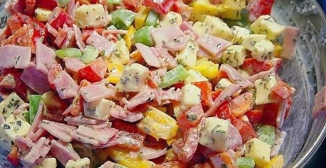 1. So als erstes die Paprikawürfel in einer Vinaigrette aus Essig, Pfeffer, Öl, Salz und den Salatkräutern ca. 40 Minuten marinieren. Danach den Käse und den gekochten Schinken dazugeben, die Sahne hinzu und je nach Gusto noch mit Paprikapulver abschmecken.