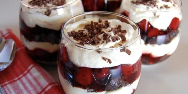 In schönen Gläsern abwechselnd Kuchenwürfel, Kirschen und Creme schichten.