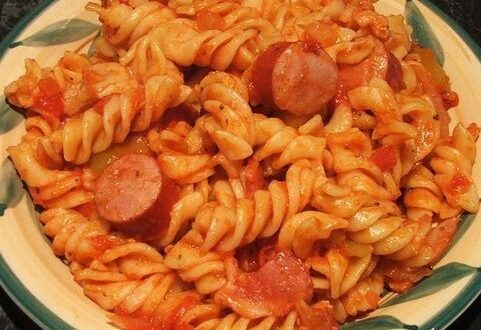 1. Als erstes die Makkaroni in Salzwasser bissfest garen. Dann Würstchen in schräge, dünne Scheiben schneiden. Die Zwiebeln und den Paprika in dünne Streifen schneiden.