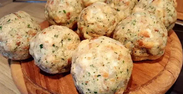 Mit nassen Händen tennisballgroße Knödel formen und in der siedenden, aber nicht sprudelnd kochenden Flüssigkeit (Salzwasser oder Brühe) in 20 Minuten gar ziehen lassen, bis sie nach oben steigen.