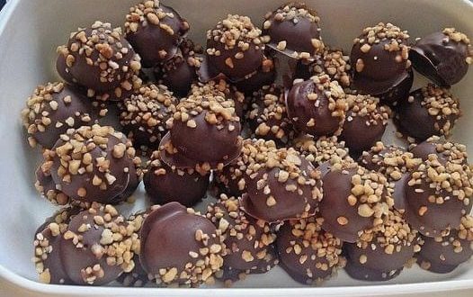 Die Kugeln nacheinander, am besten mithilfe einer Pralinengabel, mit Schokolade überziehen.