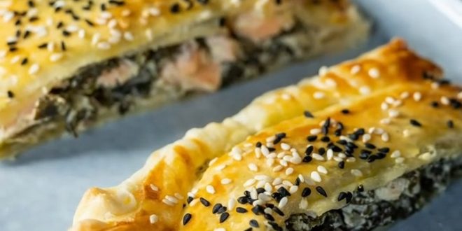 Blätterteig mit Sahne-Eigelbmischung einpinseln und mit Schwarzkümmel sowie Sesam bestreuen.