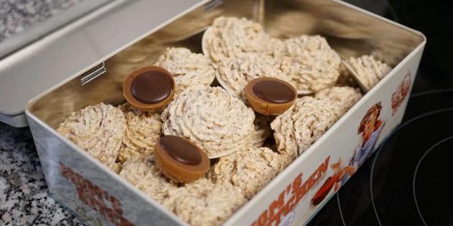 2. Jetzt auf jede Oblate ein Toffifee mit der glatten Seite nach unten legen, und die Masse darüber verteilen, bis das Toffifee nicht mehr erkennbar ist.