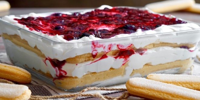 1 EL Zitronensaft 120 g Naturjoghurt 120 g Sahne 120 g Mascarpone 250 g Früchte, gemischte, (auch TK-Früchte möglich, z.B. Himbeeren und Heidelbeeren) 1 EL Zitronensaft 200 g Loffelbiskuits n. B. Minzeblätter zum Verzieren n. B. Zimtpulver oder Kakaopulver zum Verzieren