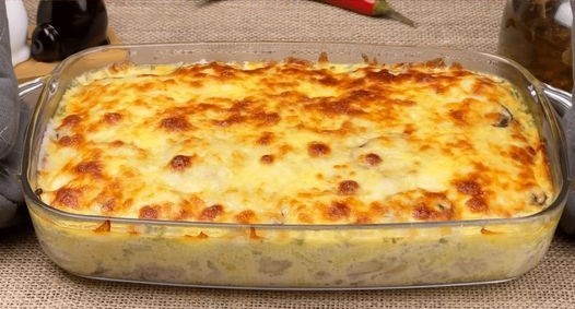 Jetzt Die Hähnchenfilets in eine gefettete Auflaufform legen und die Zwiebel-Sahne-Sauce darauf verteilen.